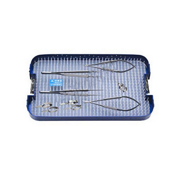 顯微外科手術器械包 HC-B801-1詳細信息: 顯微鑷15cm 0.3mm 直2把, 顯微持針鉗14cm 直1把,顯微剪14cm直1把,顯微止血夾大2只,顯微止血夾小2只,平頭沖洗針1只。配帶硅膠器...